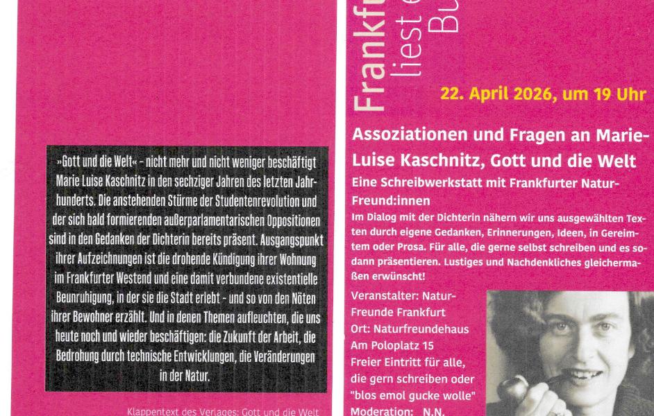 Schreibwerkstatt der NaturFreunde Frankfurt am 22. April: Assoziationen und Fragen an Marie-Luise Kaschnitz, Gott und die Welt