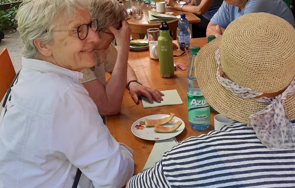 Naturfreunde treffen sich in Naturfreundehäusern. Aber an welchen Orten und Anlässen treffen sich die Frankfurter Naturfreunde noch?“ So ähnlich lautete eine der vielen Fragen eines Naturfreundequizzes, das im Zentrum des diesjährigen Bergfestes auf der Brombacher Hütte stand. In Gruppen zwischen drei und fünf Personen eingeteilt, hatten die Teilnehmer*innen in neun Fragerunden zu zeigen, ob sie sich in der Welt der Naturfreunde – und der Frankfurter Naturfreunde natürlich insbesondere – gut auskannten. Oft wurde die Anzahl der erforderten Lösungen übererfüllt, manchmal wurden Fragen zugegebenermaßen auch nicht oder falsch beantwortet. Bei Zahlenangaben ließ die „Justiziarin“ Edith meist auch eine gewisse Toleranzbreite gelten, und künstlerische Kreativität beim Zeichnen des Naturfreundlogos wurde auch mit Sonderpunkten versehen. Trotz all diesen Bewertungseifers kam es auf den Sieg letztlich nicht an, sondern auf den sichtlichen Spaß bei der Sache.